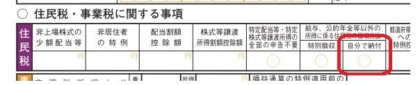対策の方法は、確定申告書B用の「住民税・事業税に関する事項」にて、「給与・公的年金等以外の~」欄の 「自分で納付」に〇 をつけるだけです。