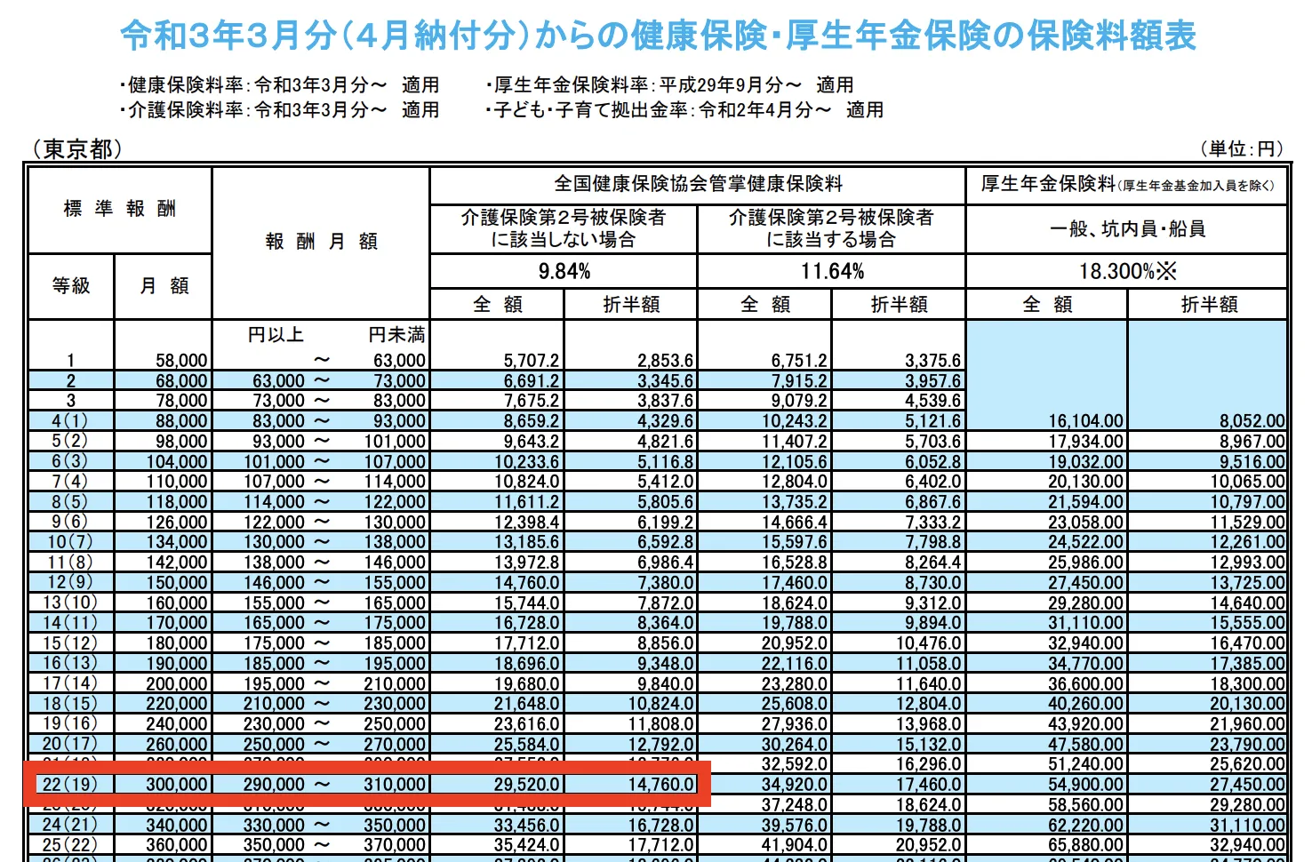 協会けんぽが提示している表に当てはめると、22等級(カッコ内の数字は厚生年金の等級)&(満40歳未満のため)介護保険がないので、画像の通りになります。