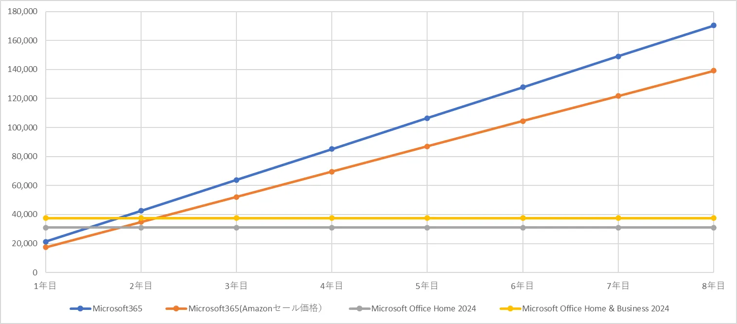 一番気になる比較対象「Microsoft Office Home 2024」ですが、2~3年以上利用する場合は買い切り版のほうが安くなります。