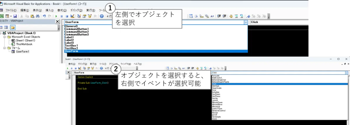| VBEの右上のリストボックス ※画像:その他-1 | プロシージャ名が表示され、選択するとそのプロシージャにジャンプする。 ※オブジェクトの場合はイベントも存在する。 | コーディング時 | ショートカットキーとは違いますが… イベントなどの場合は、左側のリストボックスでオブジェクト(UserFormとか)を選択すると右のリストボックスで選べるようになります。 |