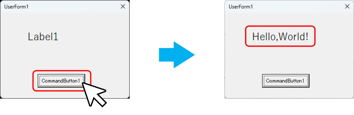 - UserForm1のLabel1のテキストをHello,World!に変更する