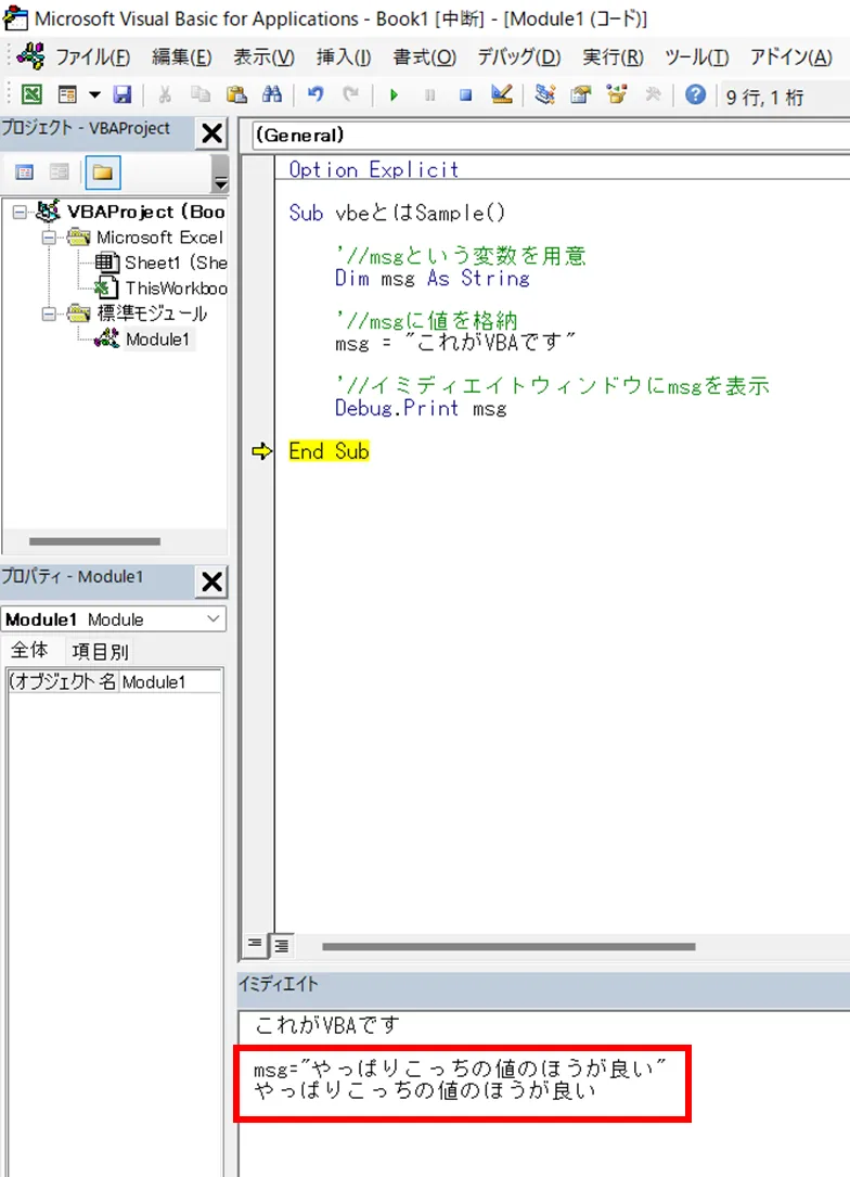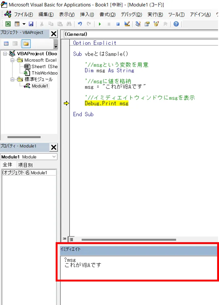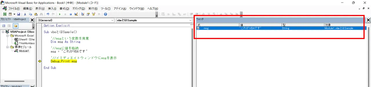 サンプルコードでは、msgに値を格納した後なので、msgの値が「これがVBAです」となっています。
