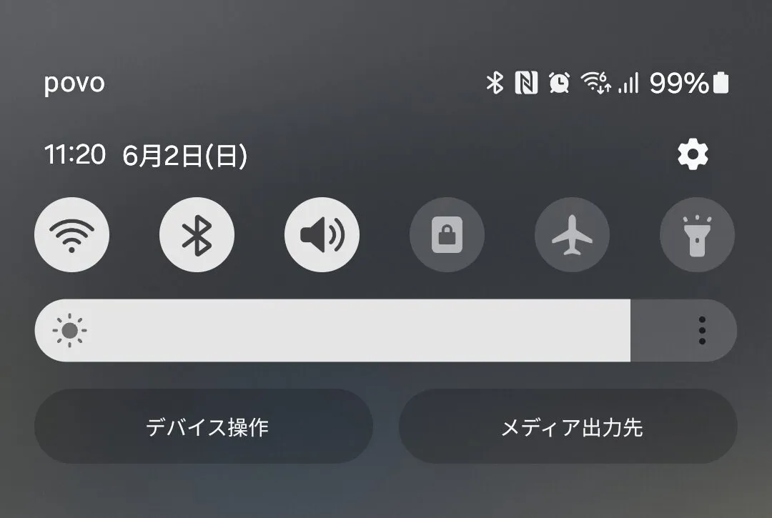 Galaxyでは、一回下にスワイプした時に右上に設定ボタンが表示されるようになっています。