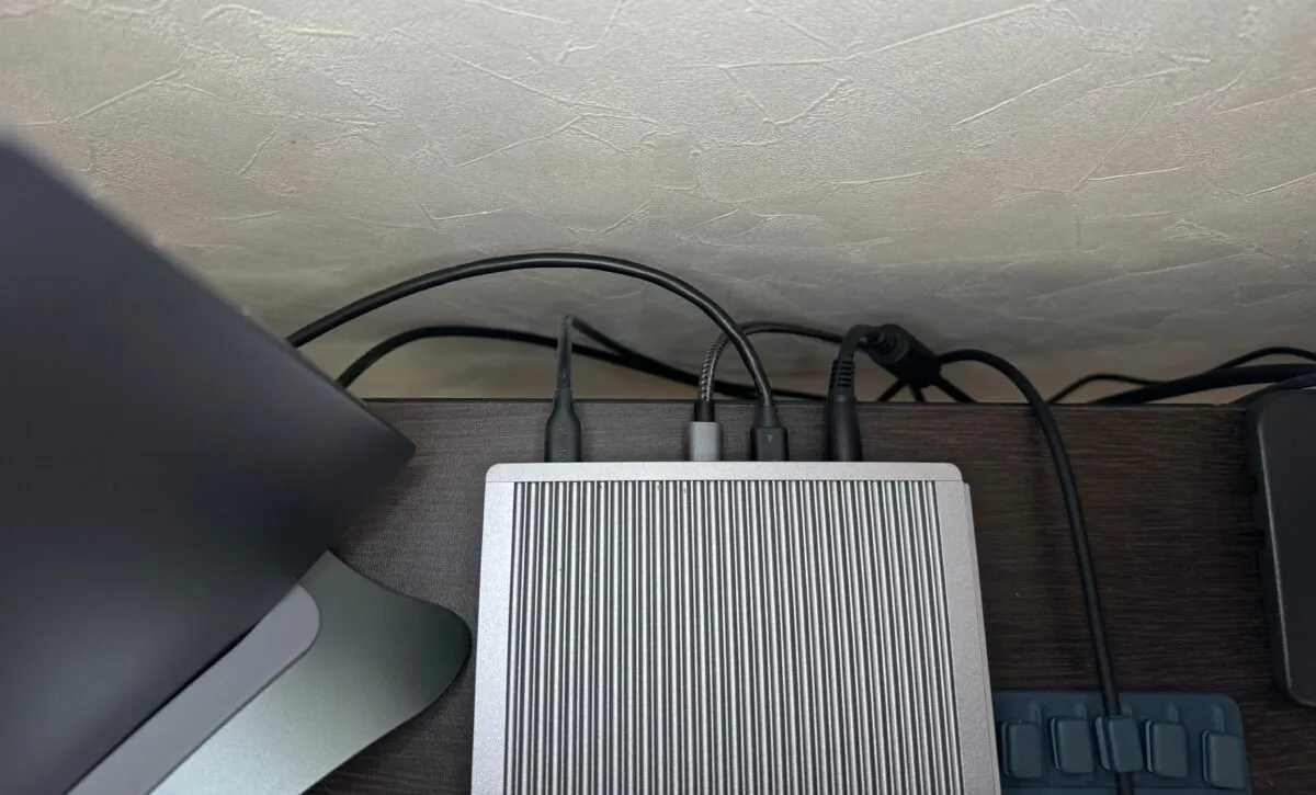 私の環境では、マグネットタイプの収納棚を机前面の板に貼り付けて、重力でケーブルに負担がかからないように工夫しています。
